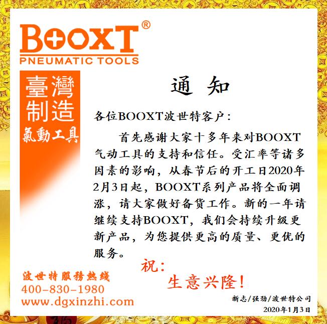 首先感謝大家十多年來對BOOXT氣動工具的支持和信任。受匯率等諸多因素的影響,從春節(jié)后的開工日2020年2月3日起,BOOXT系列產品將全面調漲,請大家做好備貨工作。新的一年請繼續(xù)支持BOOXT,我們會持續(xù)升級更新產品,為您提供更高的質量,更優(yōu)的服務。
