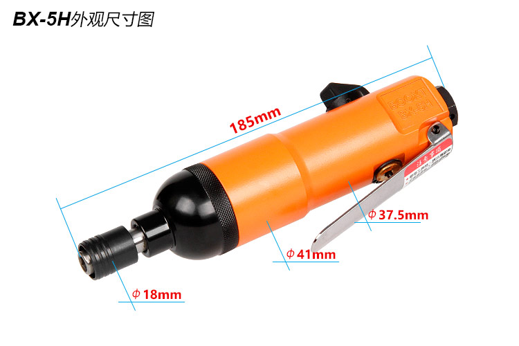 • 產(chǎn)品參數(shù): 螺栓能力:4-5mm; 空載轉(zhuǎn)速:9000rpm; 極限扭力:40Nm; 總 長:185mm; 重 量:0.78kg; 耗 氣 量:0.25m3/min; 使用工作氣壓0.65Mpa,推薦使用內(nèi)徑8mm氣管。 【專業(yè)型】