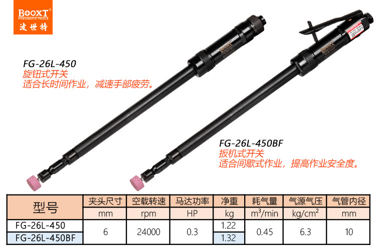 東莞市強(qiáng)勁五金工具有限公司提供臺灣BOOXT波世特品牌氣動工具,氣動加長內(nèi)孔打磨機(jī)FG-26L-450廠家直銷,首件享特價(jià)。咨詢熱線:4008301980