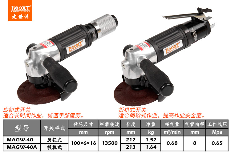東莞市強(qiáng)勁五金工具有限公司提供臺(tái)灣BOOXT波世特品牌氣動(dòng)工具,角向氣動(dòng)打磨機(jī)MAGW-40A廠(chǎng)家直銷(xiāo),首件享特價(jià)。咨詢(xún)熱線(xiàn):4008301980