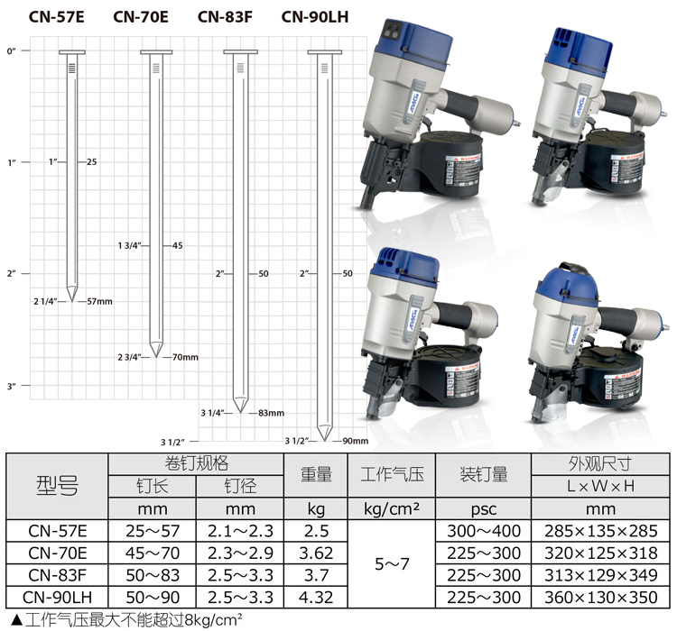 • 產(chǎn)品參數(shù): 打釘能力:50-83mm 裝釘數(shù)量:225-300PCS 工作氣壓:5-7kg/cm2 重 量:3.7kg