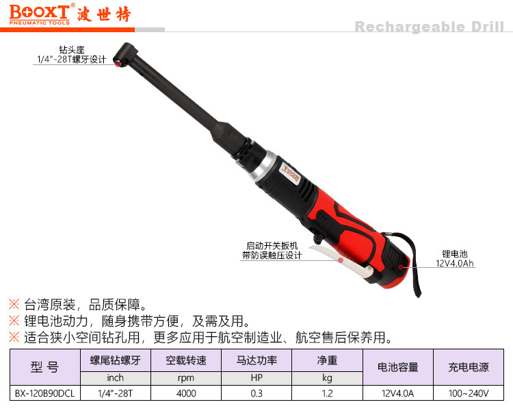 東莞市強勁五金工具有限公司提供臺灣BOOXT波世特品牌五金工具,電池航空直角鉆BX-120B90DCL廠家直銷,首件享特價。咨詢熱線:4008301980