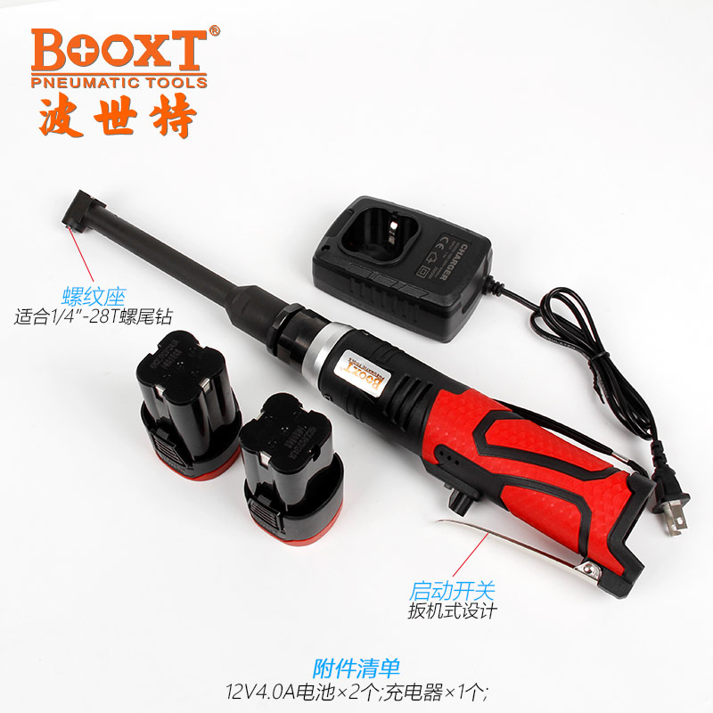 • 產(chǎn)品參數(shù): 夾頭螺牙:1/4"*28T 充電電壓:100-240V 電池電壓:12V/4.0A 空載轉(zhuǎn)速:4000rpm 馬達功率:0.3HP 全 長:455mm 重 量:1.2kg 【加長型】