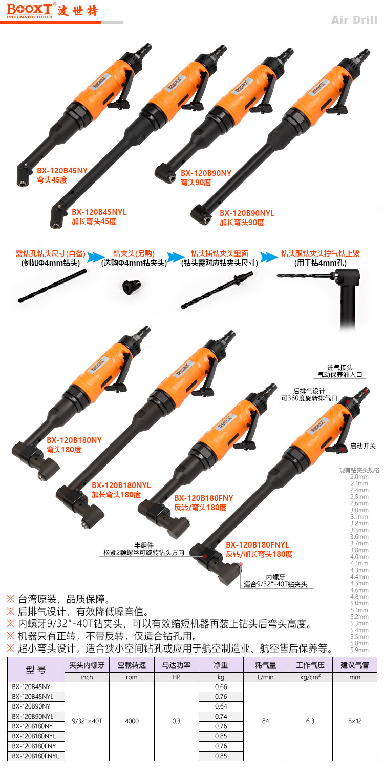 東莞市強勁五金工具有限公司提供臺灣BOOXT波世特品牌氣動工具,航空45度彎角氣鉆BX-120B45NY廠家直銷,首件享特價。咨詢熱線:4008301980