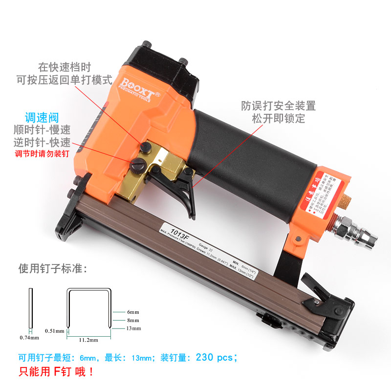 • 產(chǎn)品參數(shù): 特點(diǎn):可調(diào)節(jié)快速連打,自帶防誤打安全開關(guān);釘子寬度:11.2mm;釘子跨度:10mm;釘腳尺寸:0.51×0.74mm;使用釘子長度范圍:6-13mm;裝釘量:230個;使用工作氣壓:0.6Mpa;推薦使用內(nèi)徑6.5mm氣管;平時多注意定時排放空壓機(jī)水份
